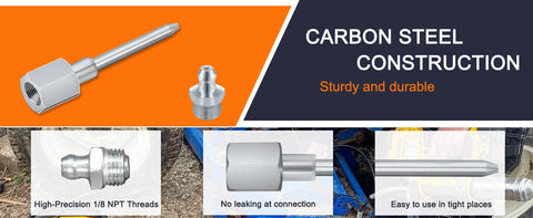 - Premium Material — Grease needle constructed from carbon steel for sturdy and durability. Special galvanized finish improves the corrosion and rust resistance and effectively extended service life.