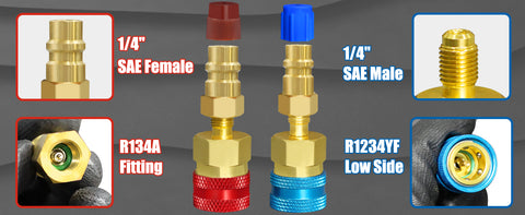 - The R1234YF Quick Connect Conversion Adapters Kit efficiently charges R-1234yf AC systems with two quick couplers – blue low side with 14mm x 1/4″ SAE male, and red high side with 17mm x 1/4″ SAE male.