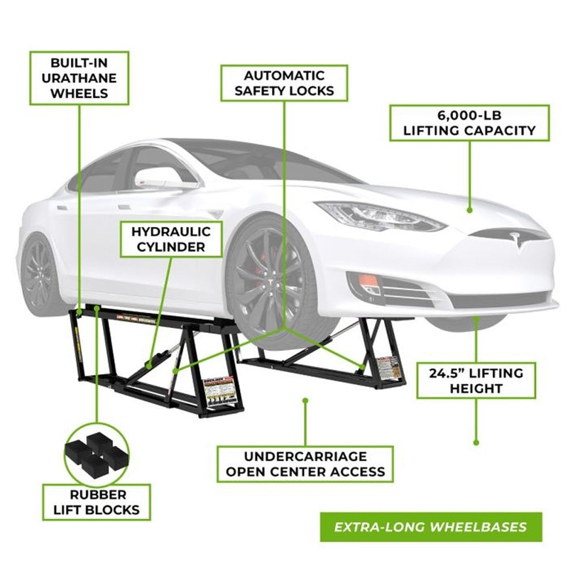 As luxury EV vehicles become more commonplace, we know auto shops and garages are going to need a portable/compact lift to work on these cars. Not every shop has a four-post or two-post, and smaller shops, such as many privately owned auto detailing shops, might not be able to fit one in their space. Thats why they get scissor lifts and low or mid-rise lifts. Unfortunately, super-long-wheelbase vehicles cant be raised by these lifts. Thats what makes the BL-6000ELX so unique. It also has a robust weight capacity to handle electric sedans, which tend to be heavier than comparably sized gas-powered cars. With a lift point spread thats longer than the frame length of a TL model, we sincerely doubt youll find a vehicle thats 6,000 lbs. or under with a wheelbase too long for this lift (outside of semi-trucks, commercial buses/mass transit vehicles, etc.).